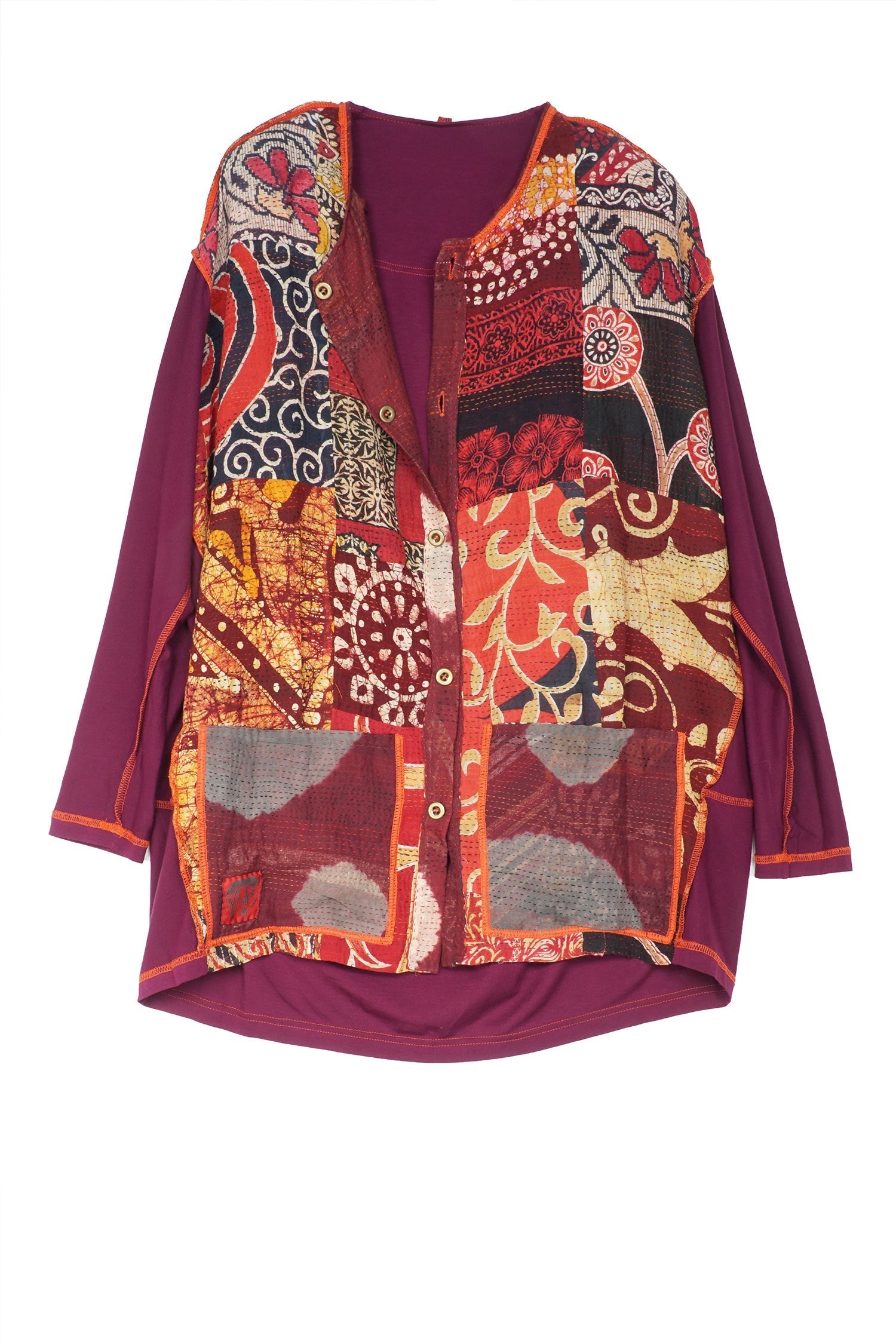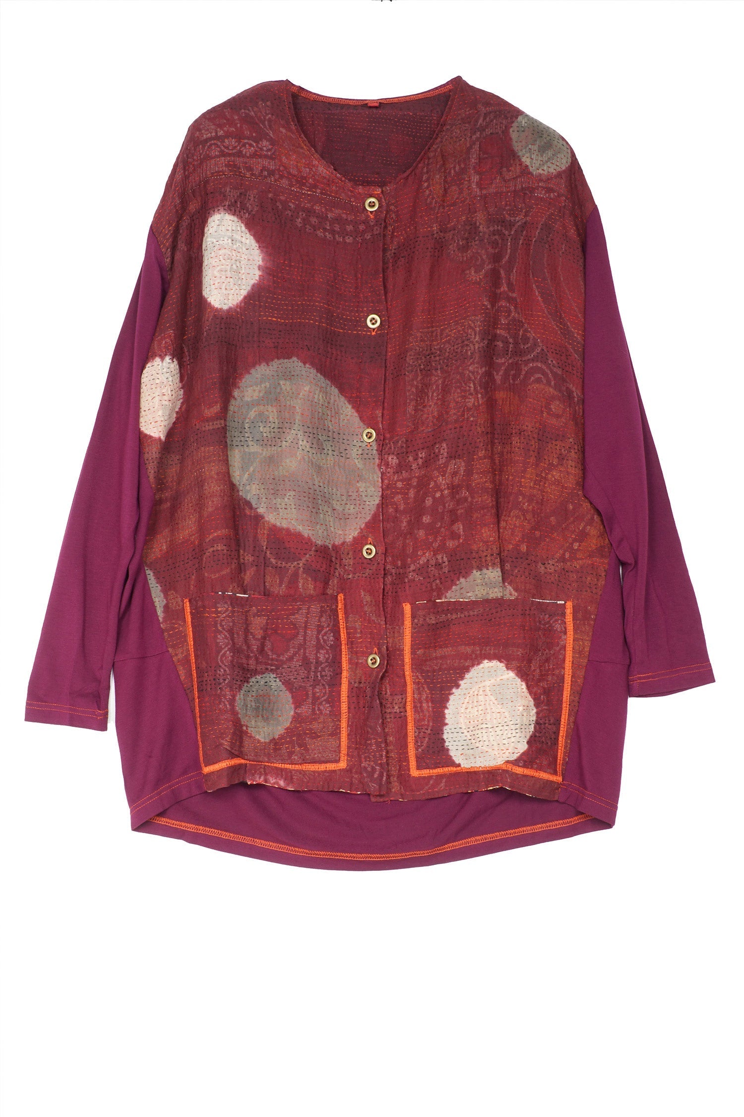 PATCH & CIRCLE PRINT KANTHA AND KNIT LONG JKT - pc2028-red -