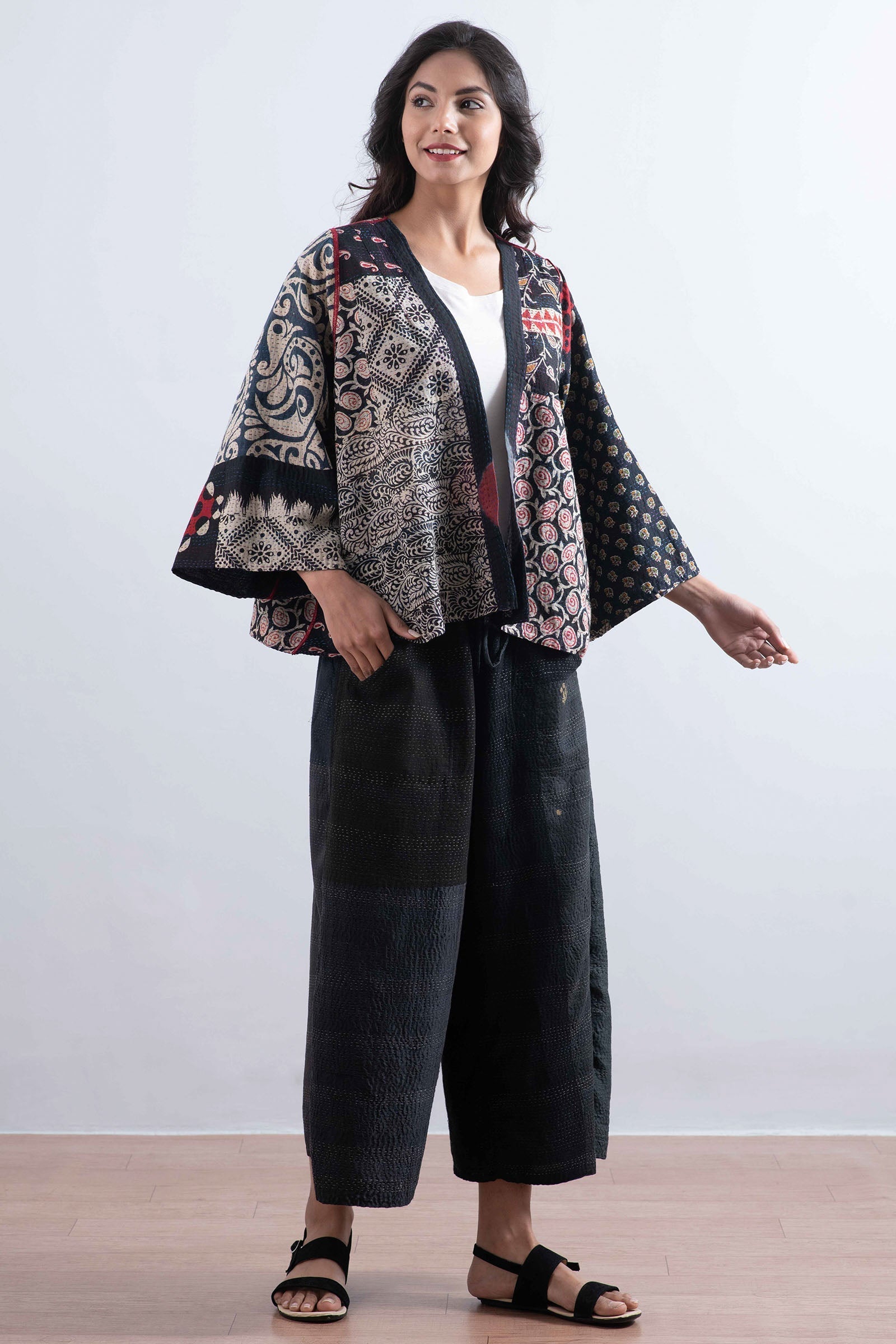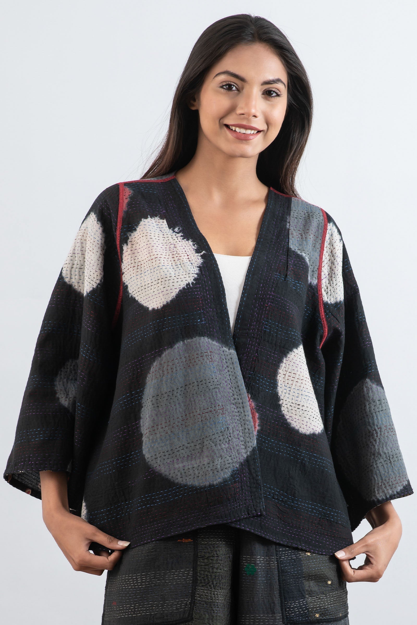PATCH & CIRCLE PRINT KANTHA BELL SHAPE JKT - pc2048-blk -