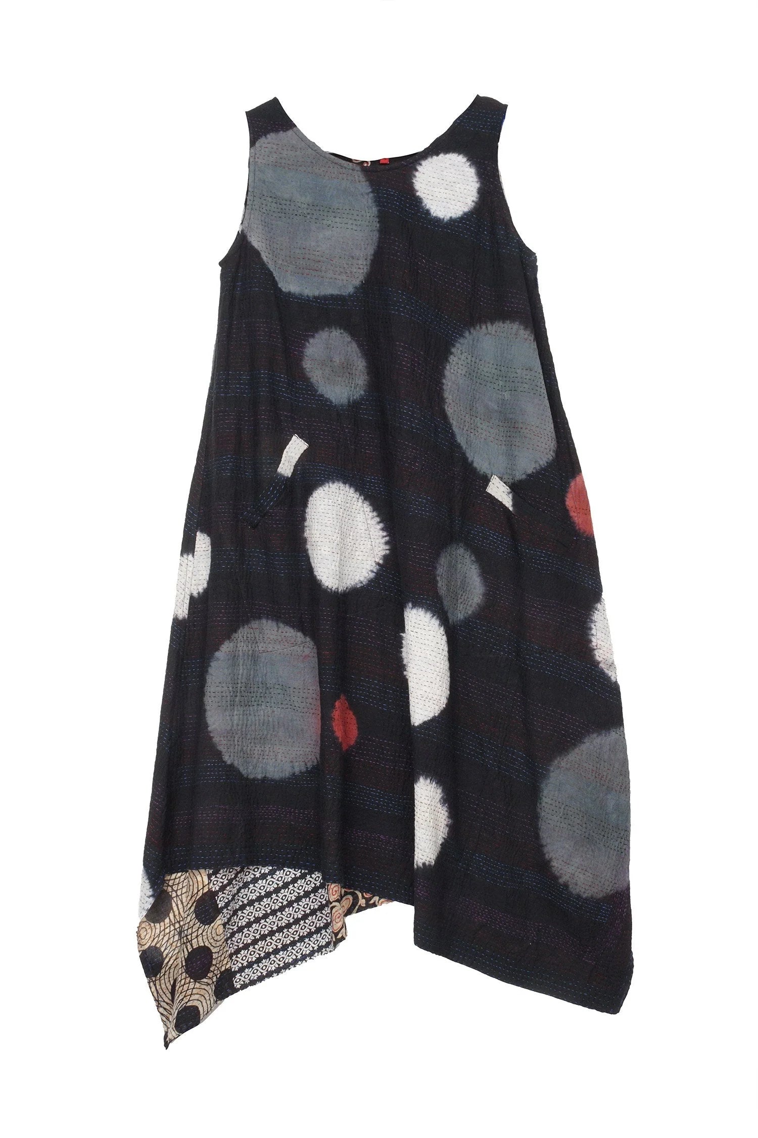 PATCH & CIRCLE PRINT KANTHA POINTY HEM DRESS - pc2415-blk -