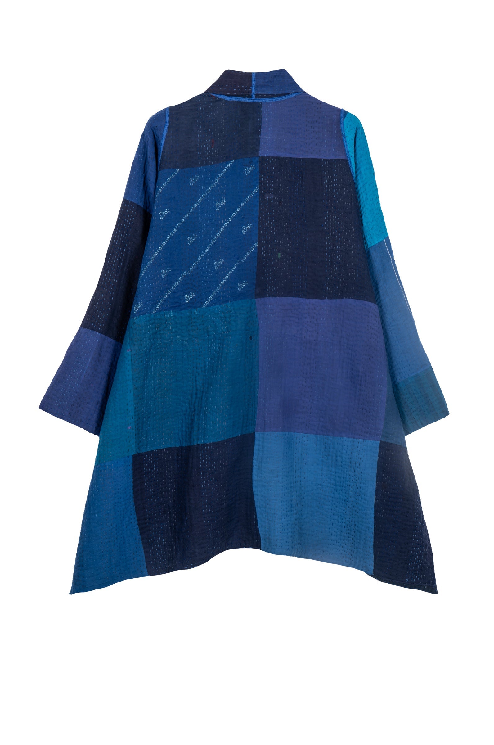 STRIPE AND CHECK COTTON SILK PATCH KANTHA A-LINE JACKET - ss4003-blu -