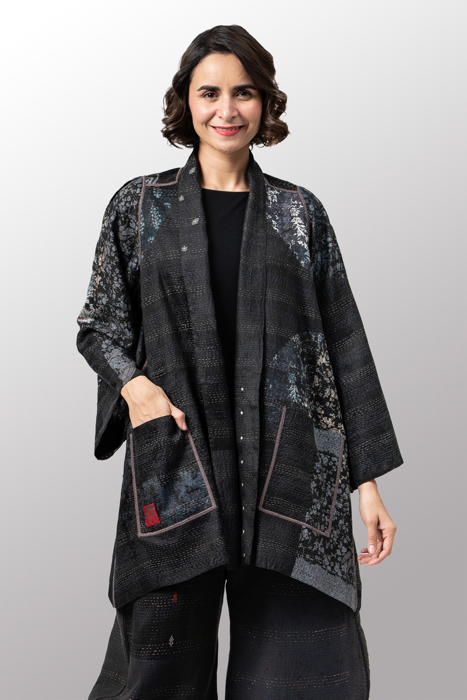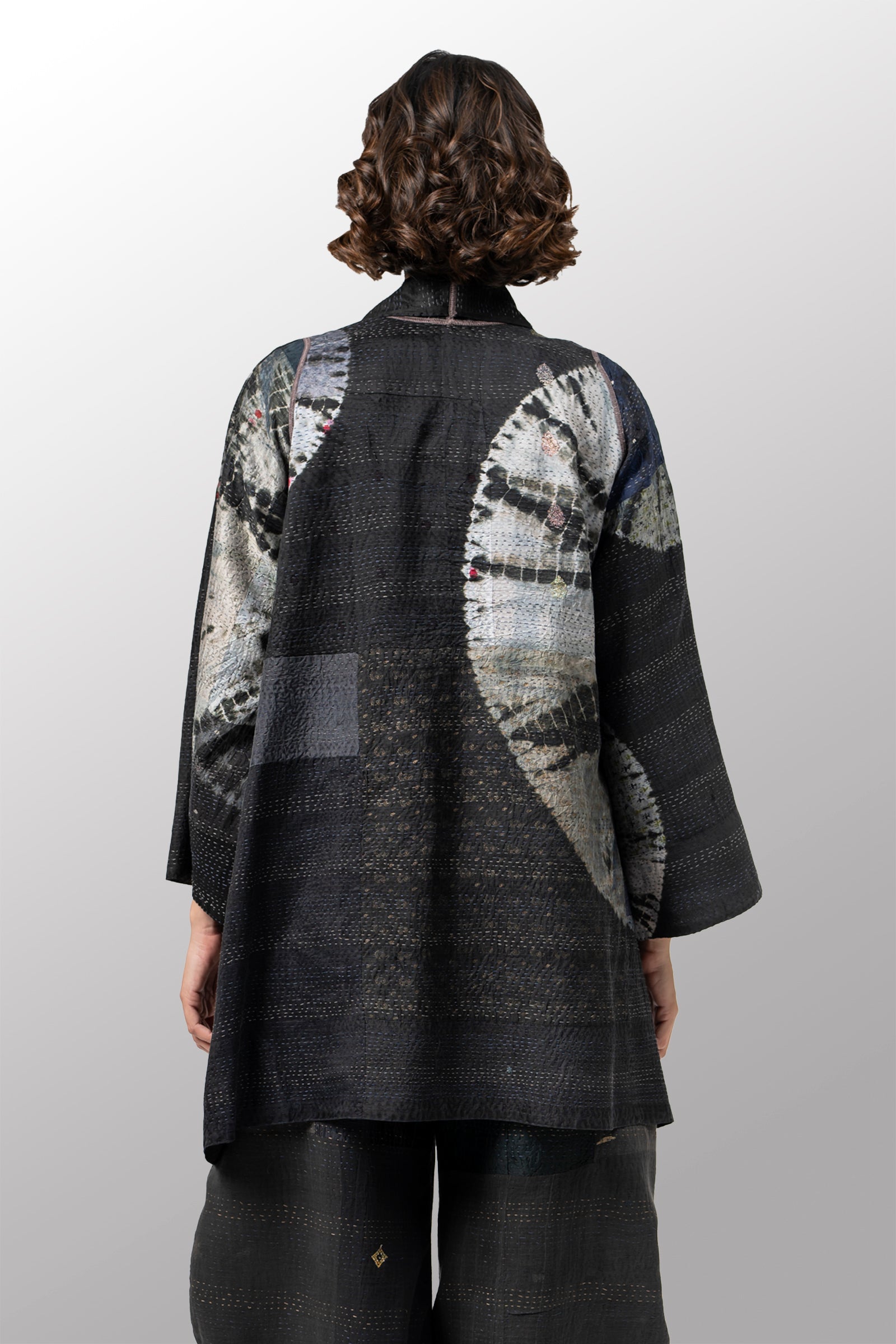 TIE DYE CIRCLE SHIBORI KANTHA A-LINE JACKET - td2003-blk -