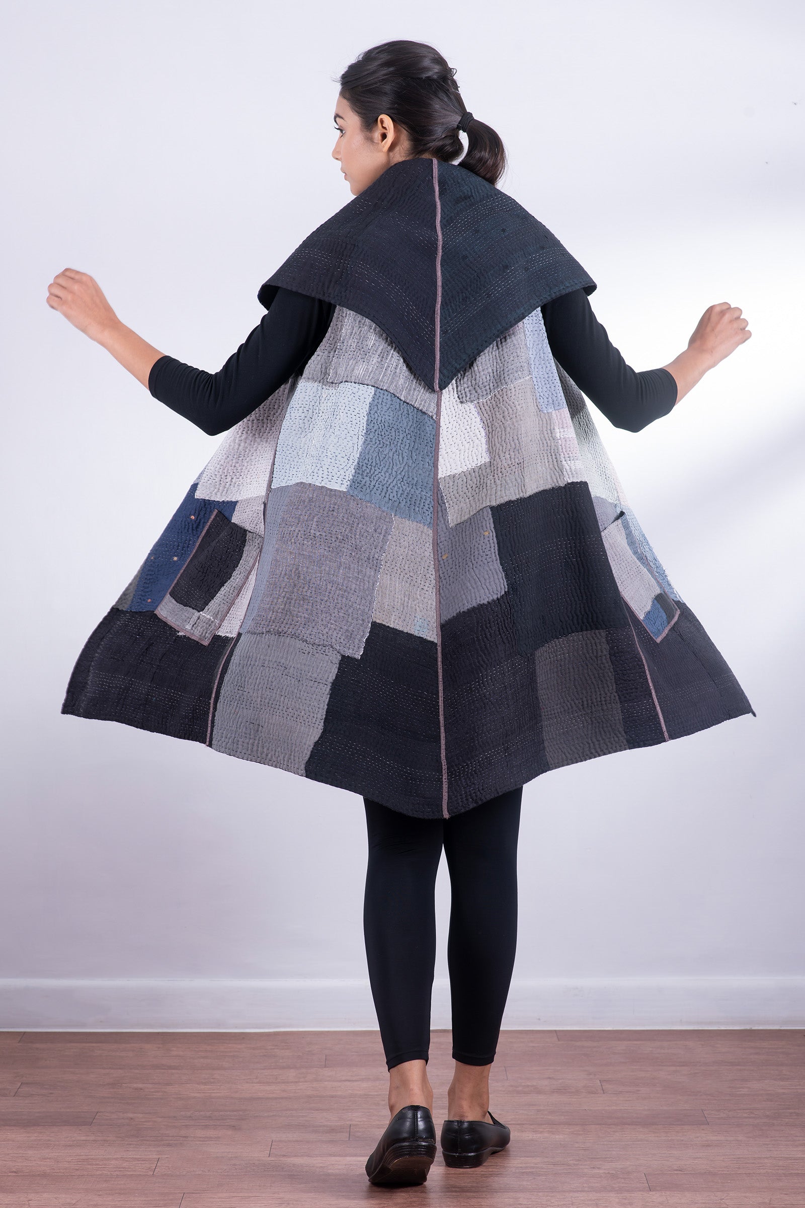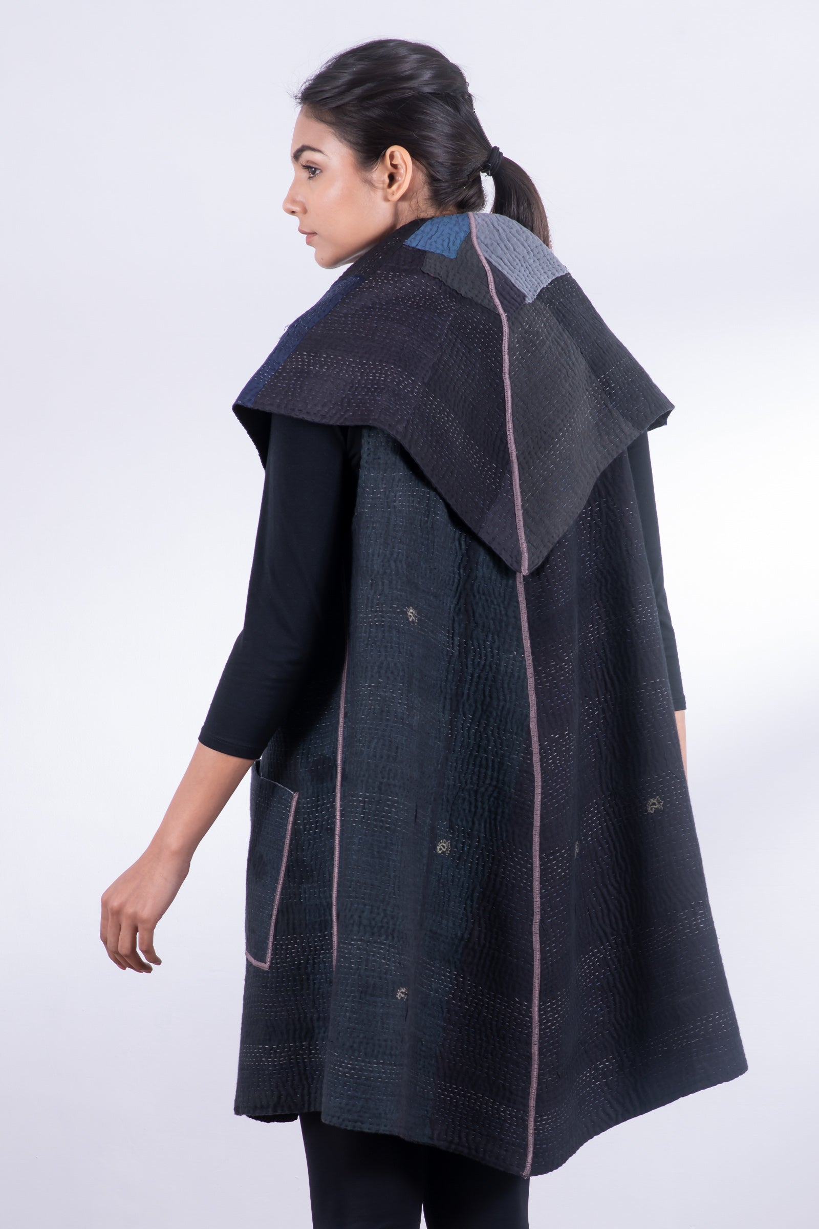 TWO TONE PATCH KANTHA CIRCULAR VEST - tn4201-blk -