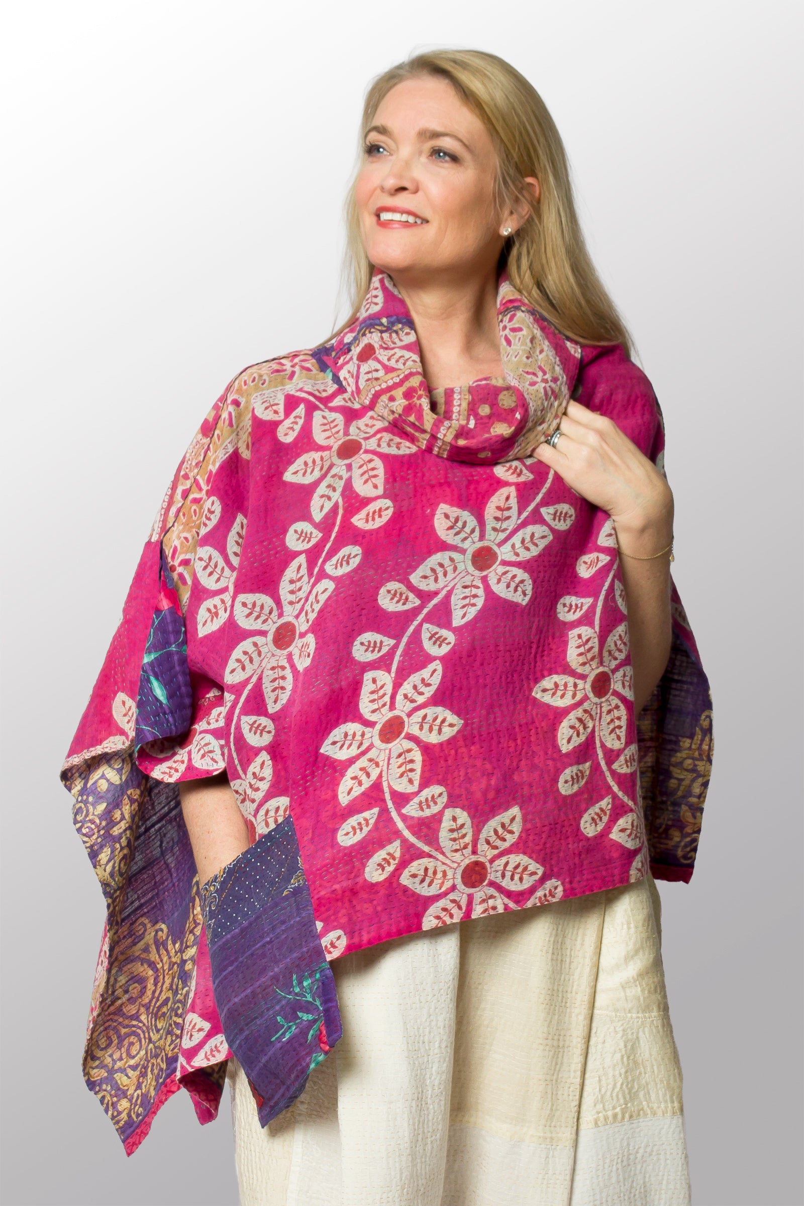VINTAGE COTTON KANTHA COWL NECK LONG CAPE - cv2842-0004a -