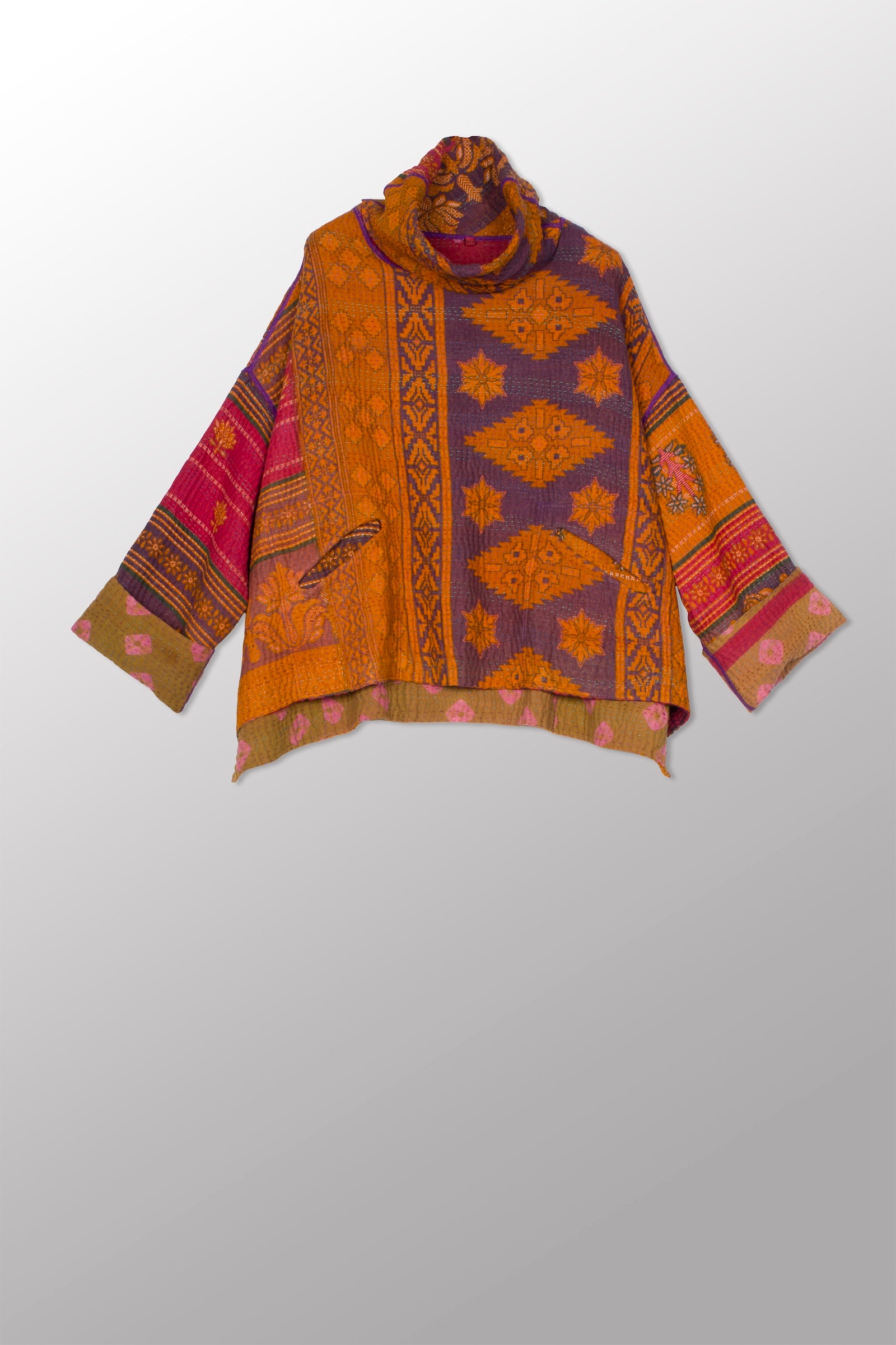VINTAGE COTTON KANTHA NEW COWL NECK PONCHO - cv4083-0002a -