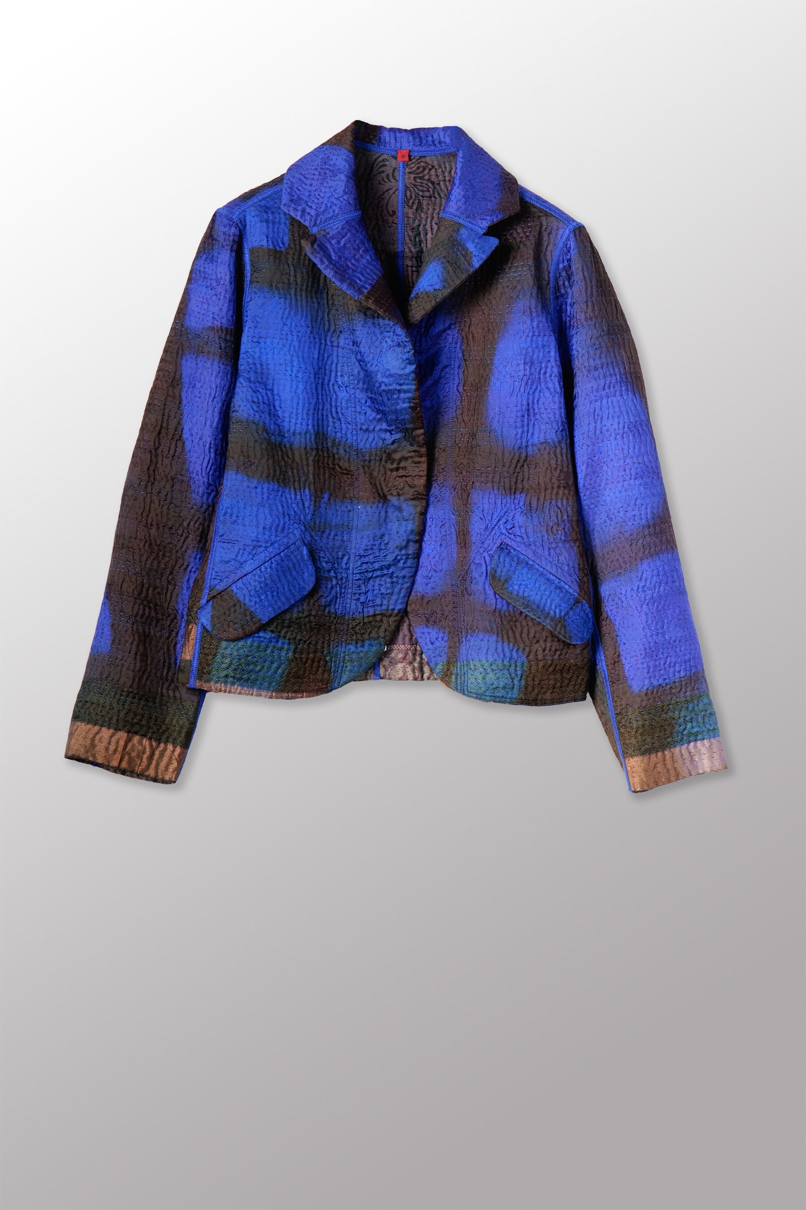 VINTAGE JACQUARD CLAMP DYE WITH PRINTED SILK KANTHA CROPPED BASIC JACKET - jk4096-0002m -