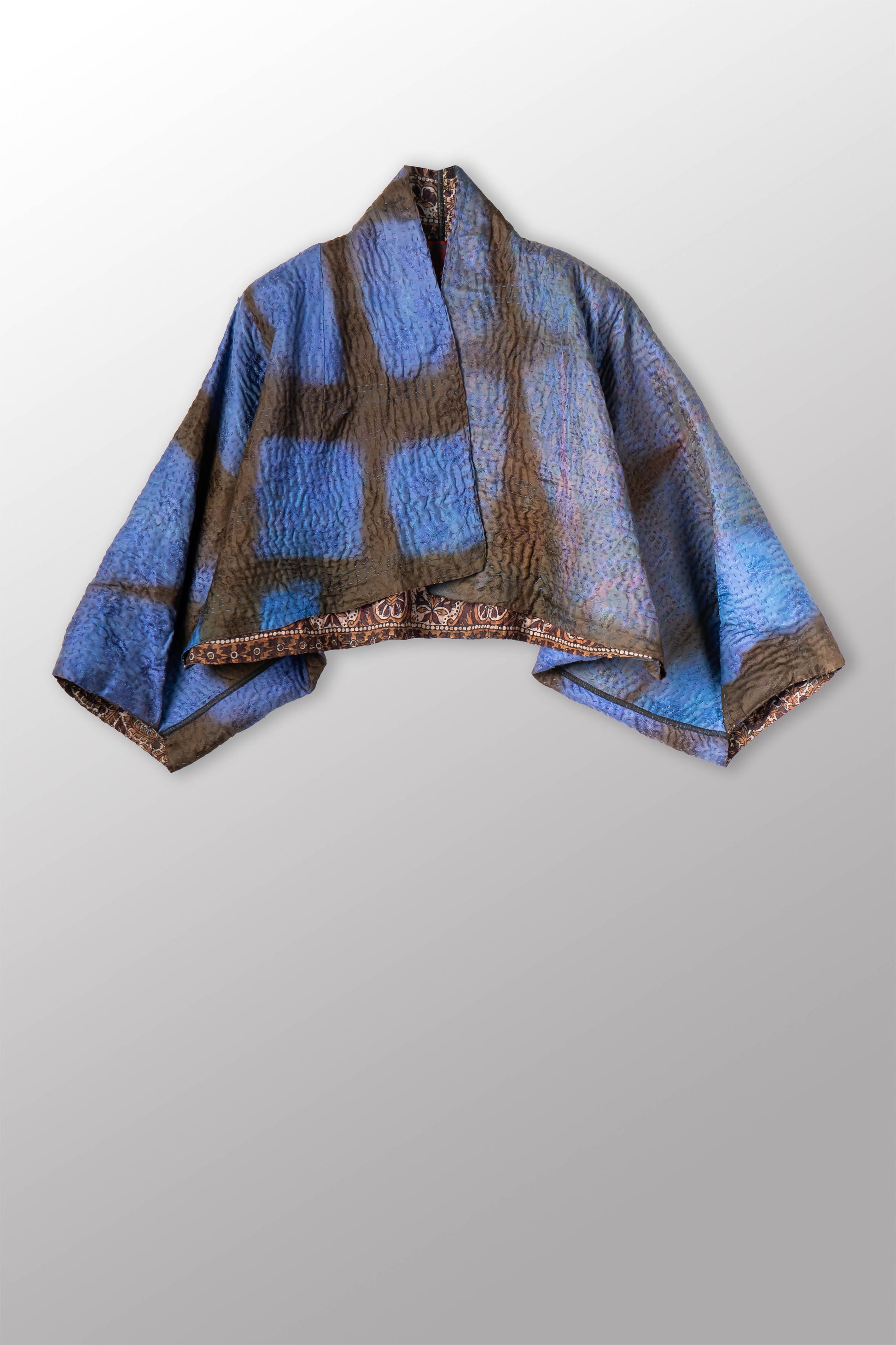 VINTAGE JACQUARD CLAMP DYE WITH PRINTED SILK KANTHA PUFF SLV. SHRUG - jk4062-0002a -