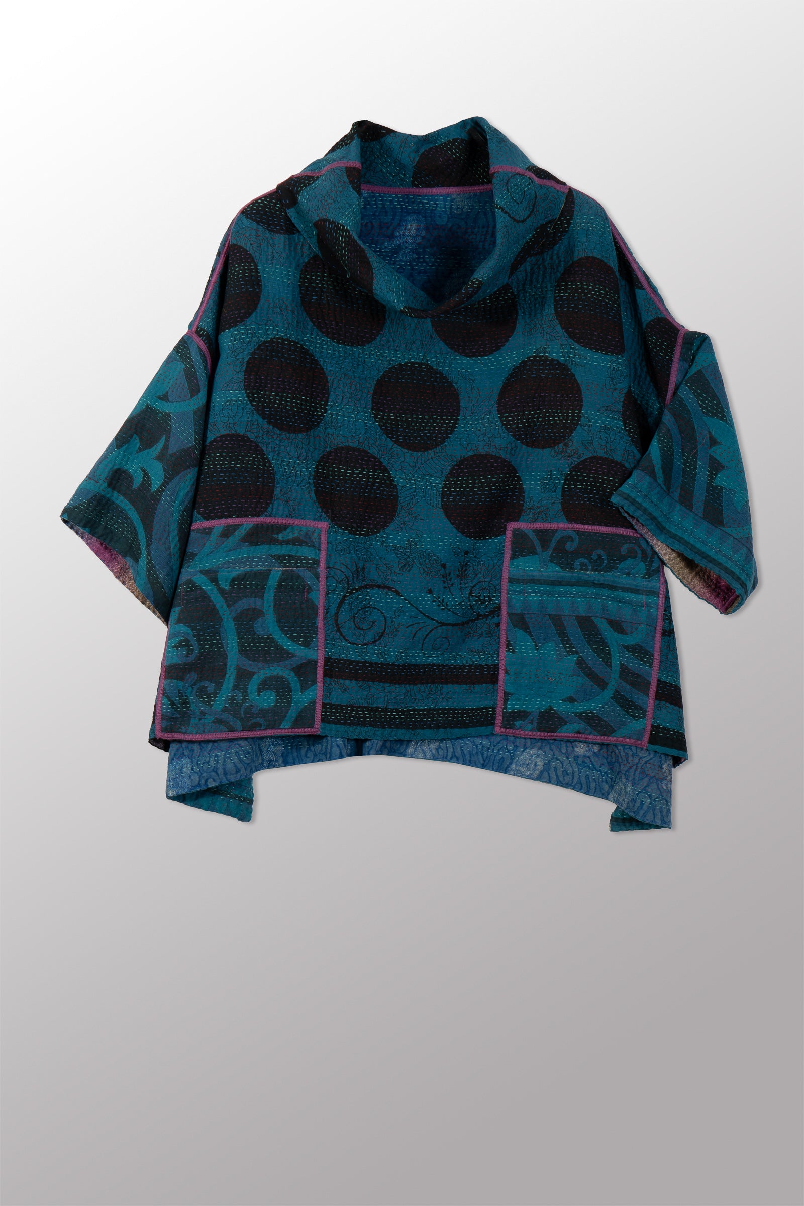 VINTAGE SILK GEORGETTE COTTON KANTHA COWL NECK PONCHO - gc2061-0002a -