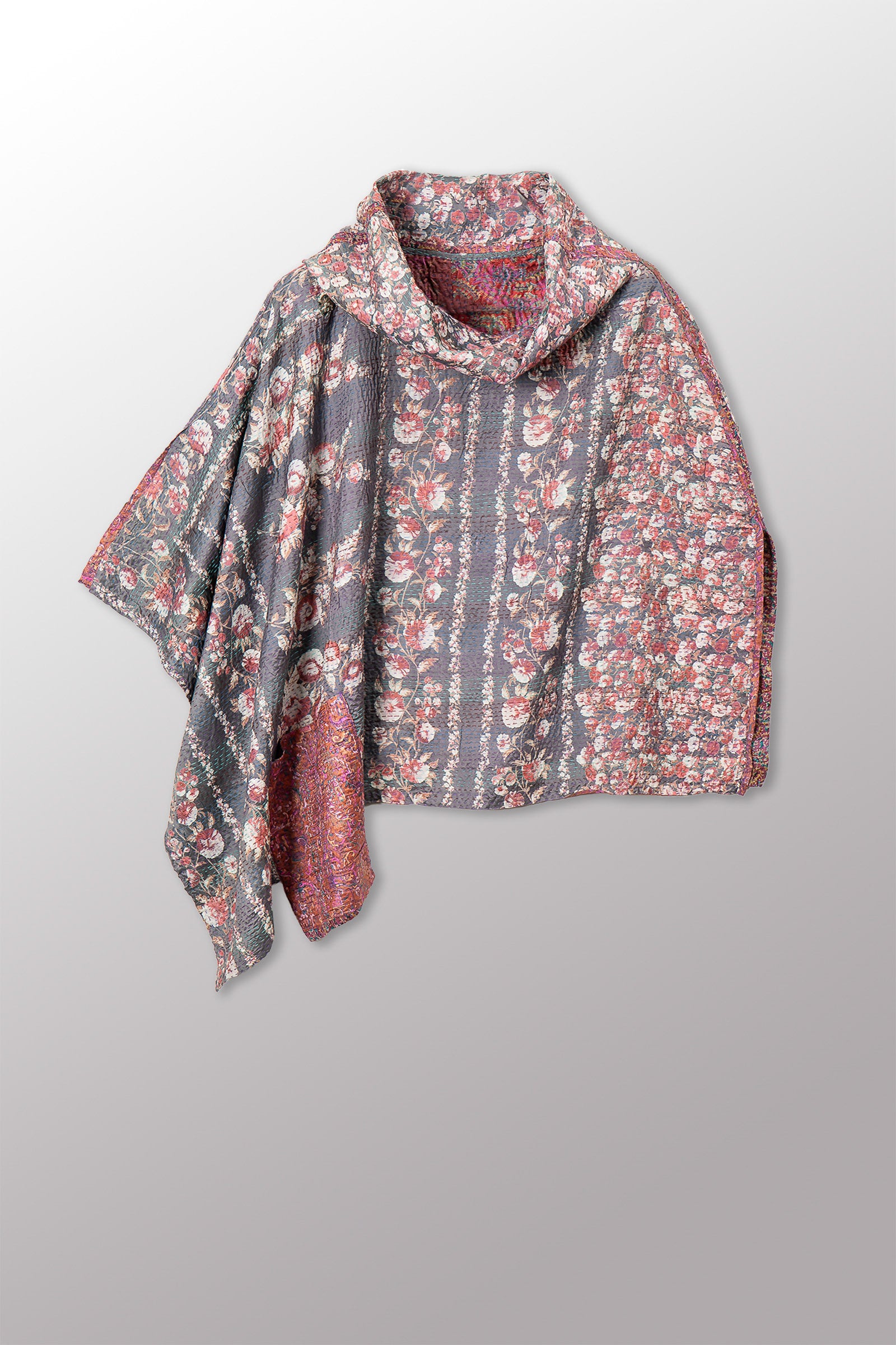 VINTAGE SILK KANTHA COWL NECK LONG CAPE - sv2842-0018a -
