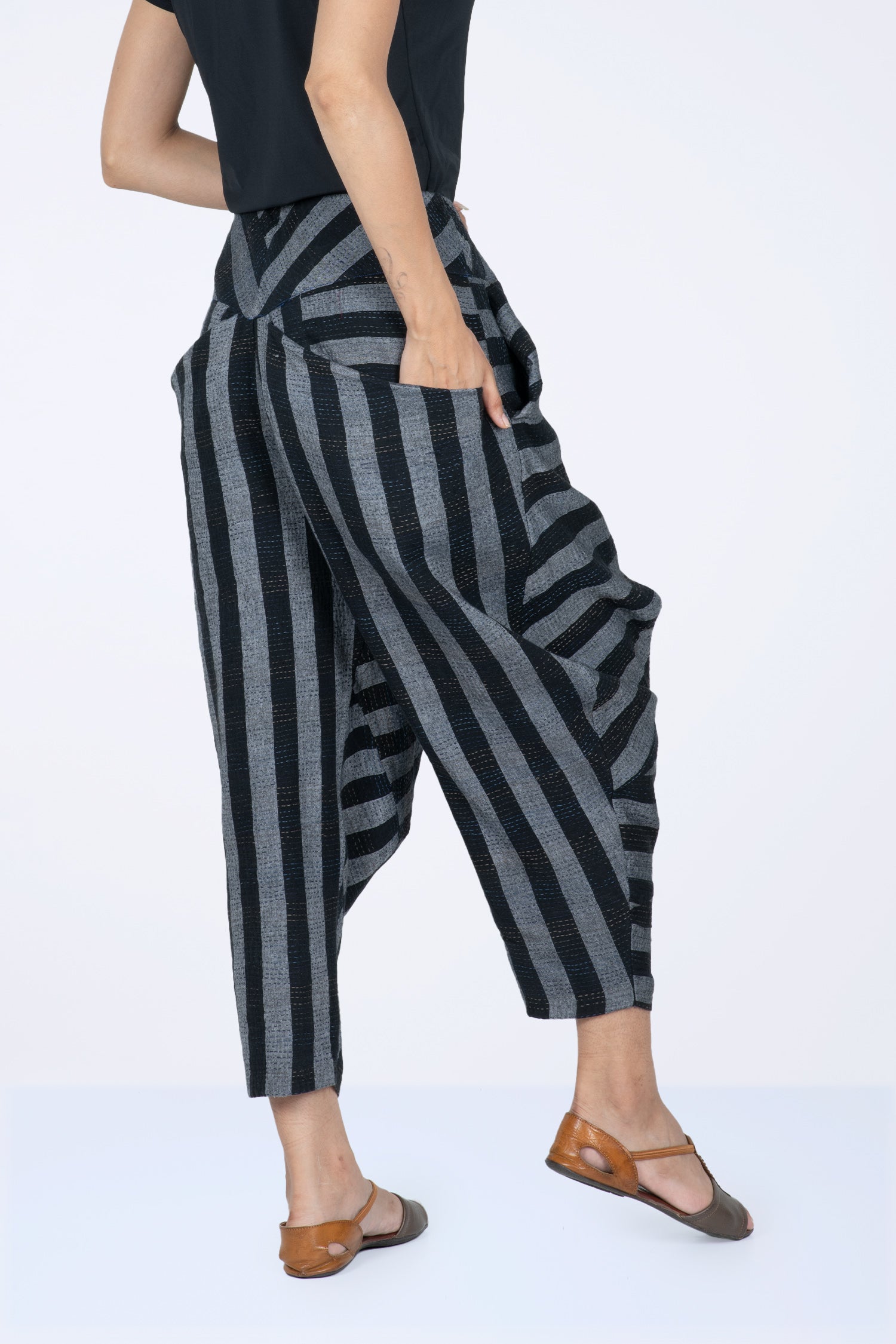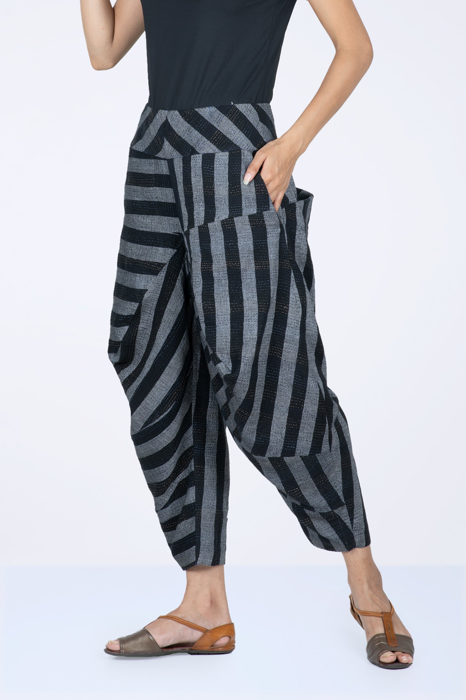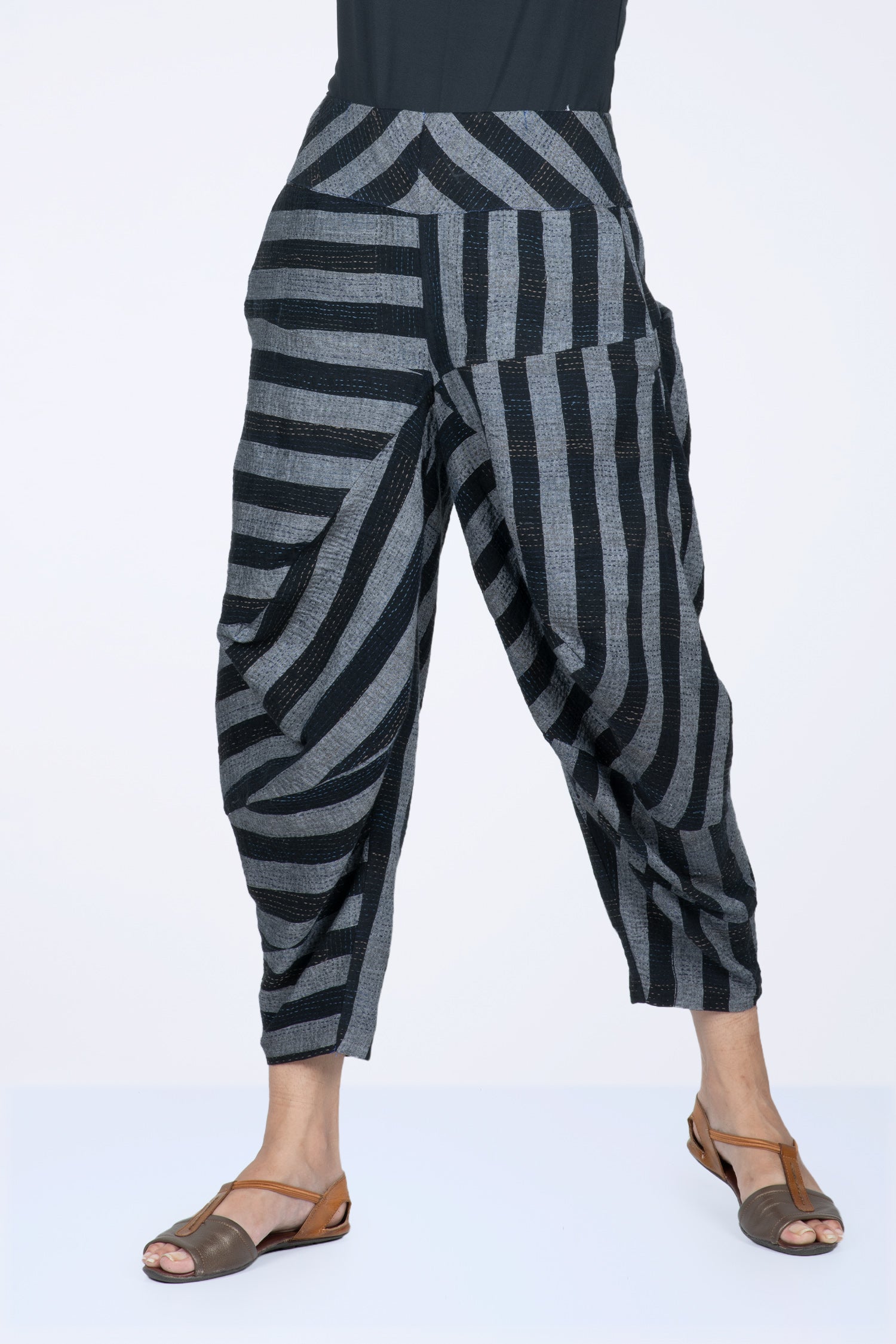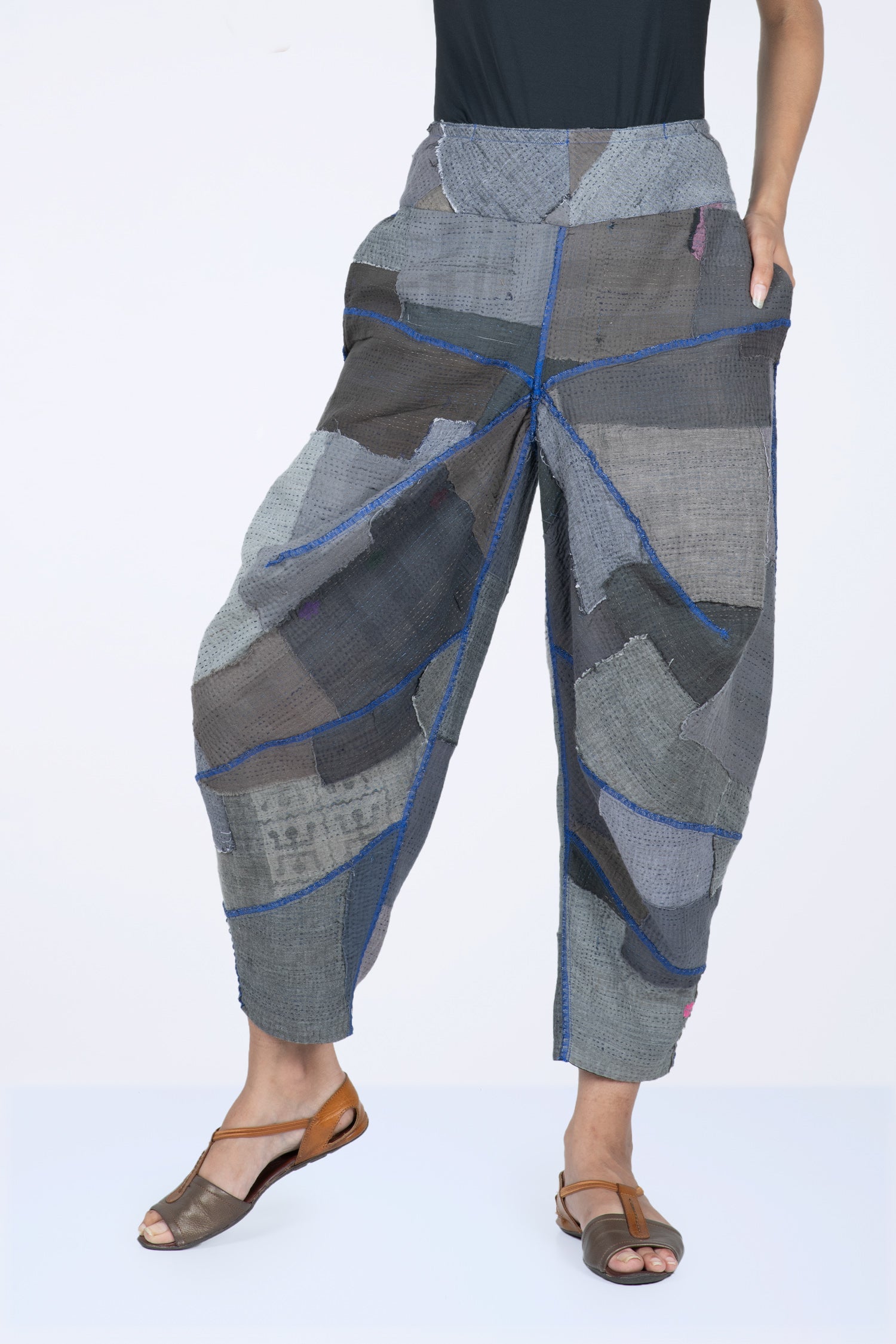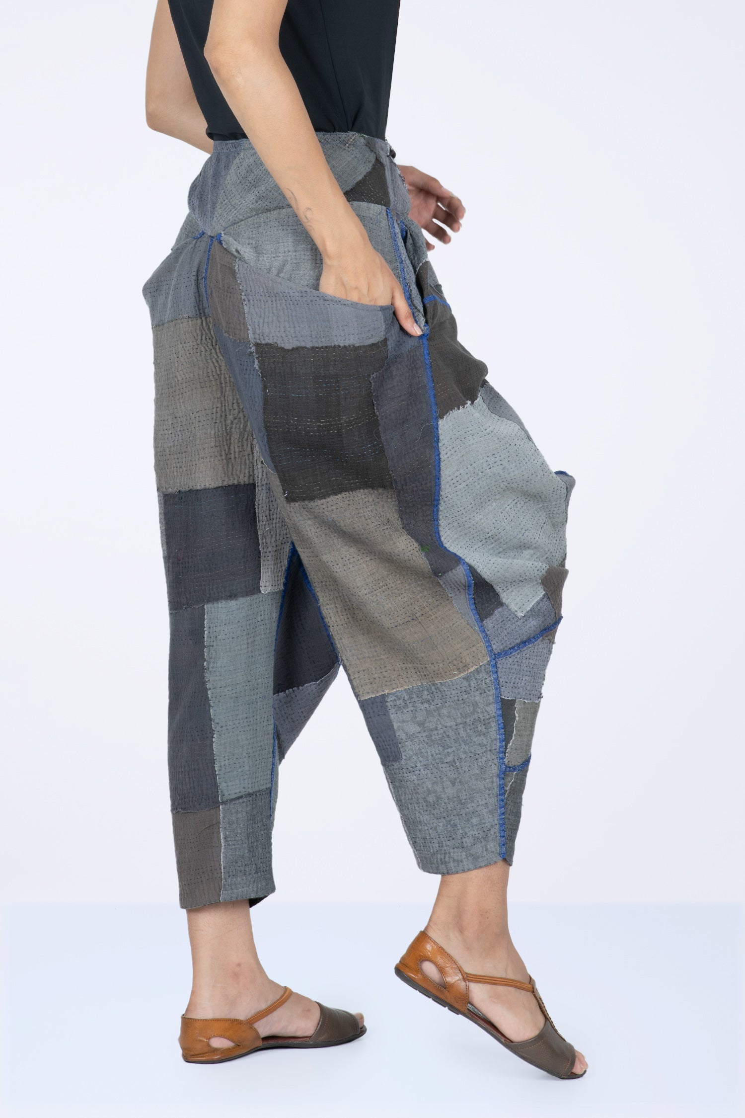 WOVEN STRIPE FRAYED PATCH BACK KANTHA YAMAHA PANTS - wp2632-gry -